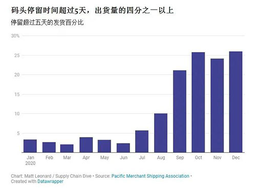 洛杉磯、長灘港口情況嚴(yán)峻,新的一年并沒有太大的改觀。依然是擁堵嚴(yán)重,新冠感染人數(shù)的上升和陸地運輸?shù)难舆t,讓港口貨物堆積越來越多,增加了集裝箱船卸貨的進(jìn)度。很多國內(nèi)過來的集裝箱船都無法靠港卸貨,相關(guān)人士預(yù)計普船靠港卸貨時間預(yù)計需要一到兩周的時間。