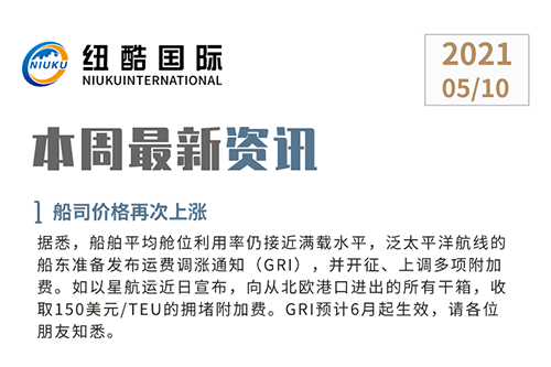 據(jù)悉,船舶平均艙位利用率仍接近滿載水平,泛太平洋航線的船東準備發(fā)布運費調(diào)漲通知(GRI),并開征、上調(diào)多項附加費。如以星航運近日宣布,向從北歐港口進出的所有干箱,收取150美元/TEU的擁堵附加費。GRI預計6月起生效,請各位朋友知悉。