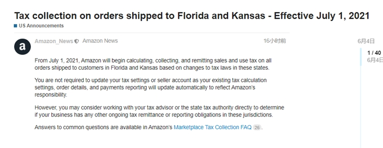 近日亞馬遜美國站發(fā)布一則公告稱,將對運(yùn)往佛羅里達(dá)州和堪薩斯州的訂單征稅。亞馬遜公告如下: