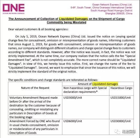 11月10日,ONE也發(fā)布通知重申“關(guān)于征收貨物品名瞞報(bào)、漏報(bào)或錯(cuò)報(bào)違約金的通知”。強(qiáng)調(diào)通知發(fā)出之后,將按照原通知的標(biāo)準(zhǔn),嚴(yán)格執(zhí)行收費(fèi)。最高罰款30000美元/箱,約合20萬(wàn)元人民幣。